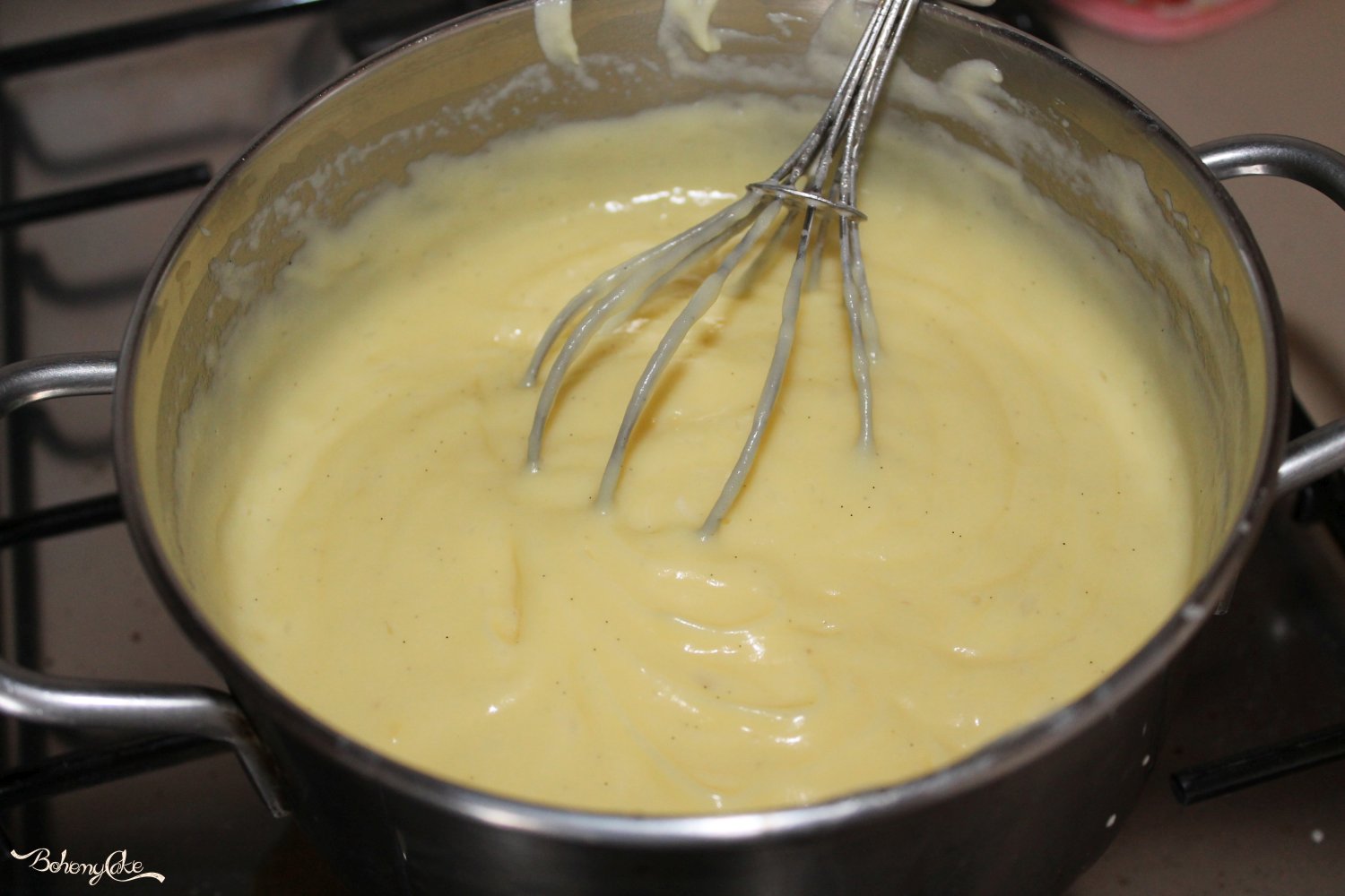 Con una pinza, eliminate la bacca e versate il latte riscaldato sul composto a filo, amalgamando il tutto con la frusta. Riportate il composto sul fuoco e mescolate continuamente fino a che la crema non si sarà addensata. Trasferite la crema pasticcera in una ciotola e fatela raffreddare conservandola con un foglio di pellicola a contatto. Ora potete utilizzare la vostra squisita crema per accompagnare oppure per farcire i vostri dolci!
