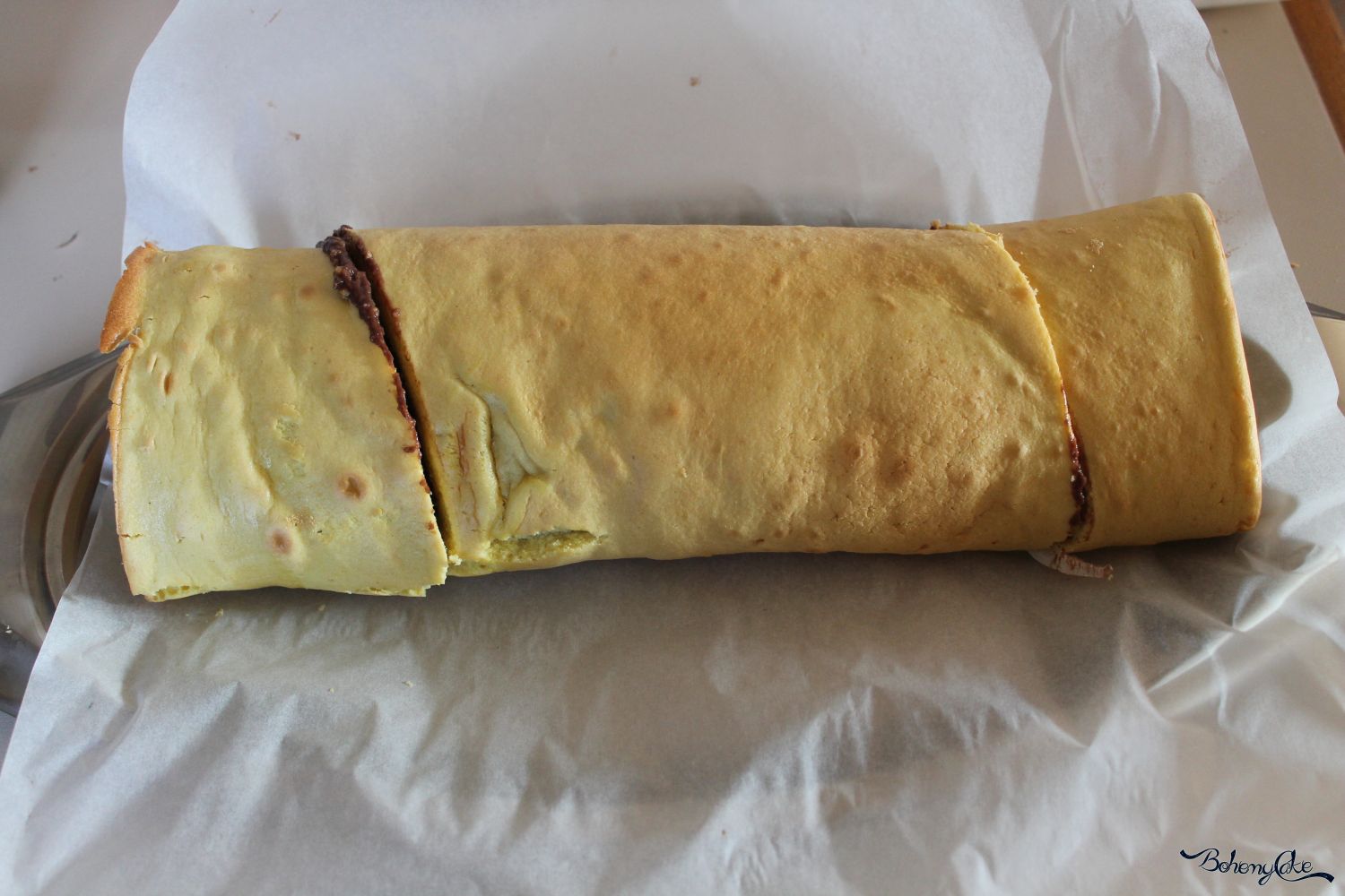 Una volta che il bisquit è le creme sono ben fredde, farcite la base spalmando la crema al cacao su tutta la superficie ma lasciando qualche centimetro vuoto sui bordi. Arrotolate con cura il dolce, avvolgetelo con della carta da forno e ponetelo per almeno 1 ora in frigorifero ad assestarsi. Trascorso il tempo, togliete dal frigorifero il rotolo, togliete la carta da forno e adagiatalo sul piatto da portata. Tagliate trasversalmente le due estremità del rotolo e tenetele da parte.