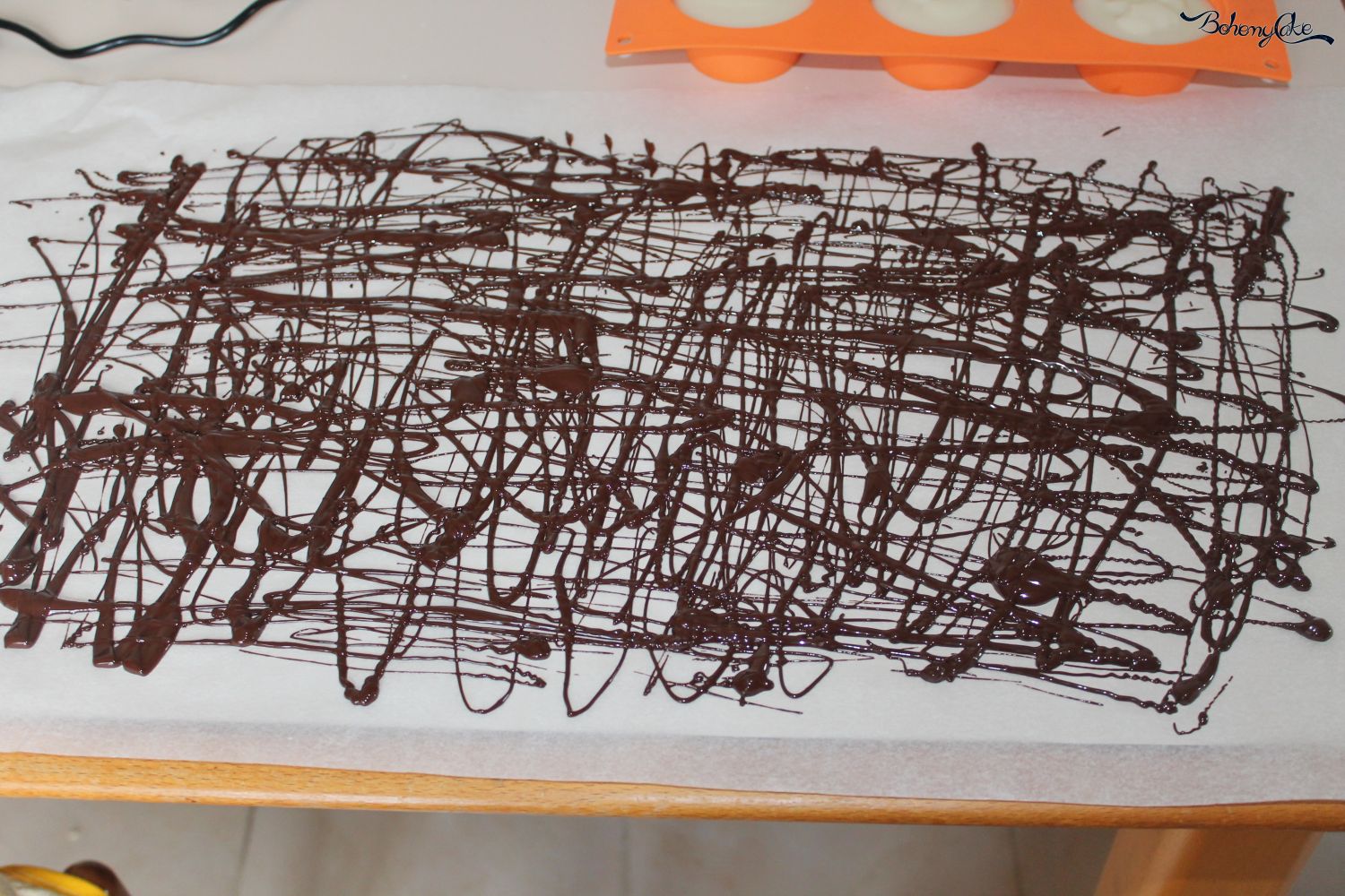 Per realizzare il reticolato di cioccolato fondente, potete anche temperare il cioccolato, ma i decori sono talmente piccoli che basterà anche solamente scioglierlo a bagnomaria o al forno a microonde.