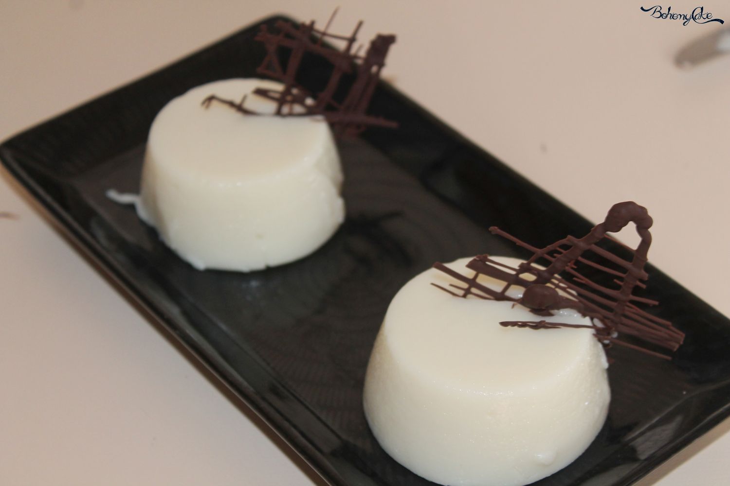 Versate il composto ottenuto in stampi in silicone o in quelli usa e getta e lasciateli raffreddate a temperatura ambiente per poi trasferirli in frigorifero per un paio di ore. Nel frattempo, preparate il decoro in cioccolato facendo sciogliere quest’ultimo a bagnomaria o nel forno a microonde. Su un foglio di carta da forno realizzate casualmente delle strisce di cioccolato fino a realizzare un disegno unico e fatelo riposare. Quando il biancomangiare si sarà addensato, sformatelo e decoratelo con pezzi del reticolato di cioccolato e palline di cioccolato bianche e nere.