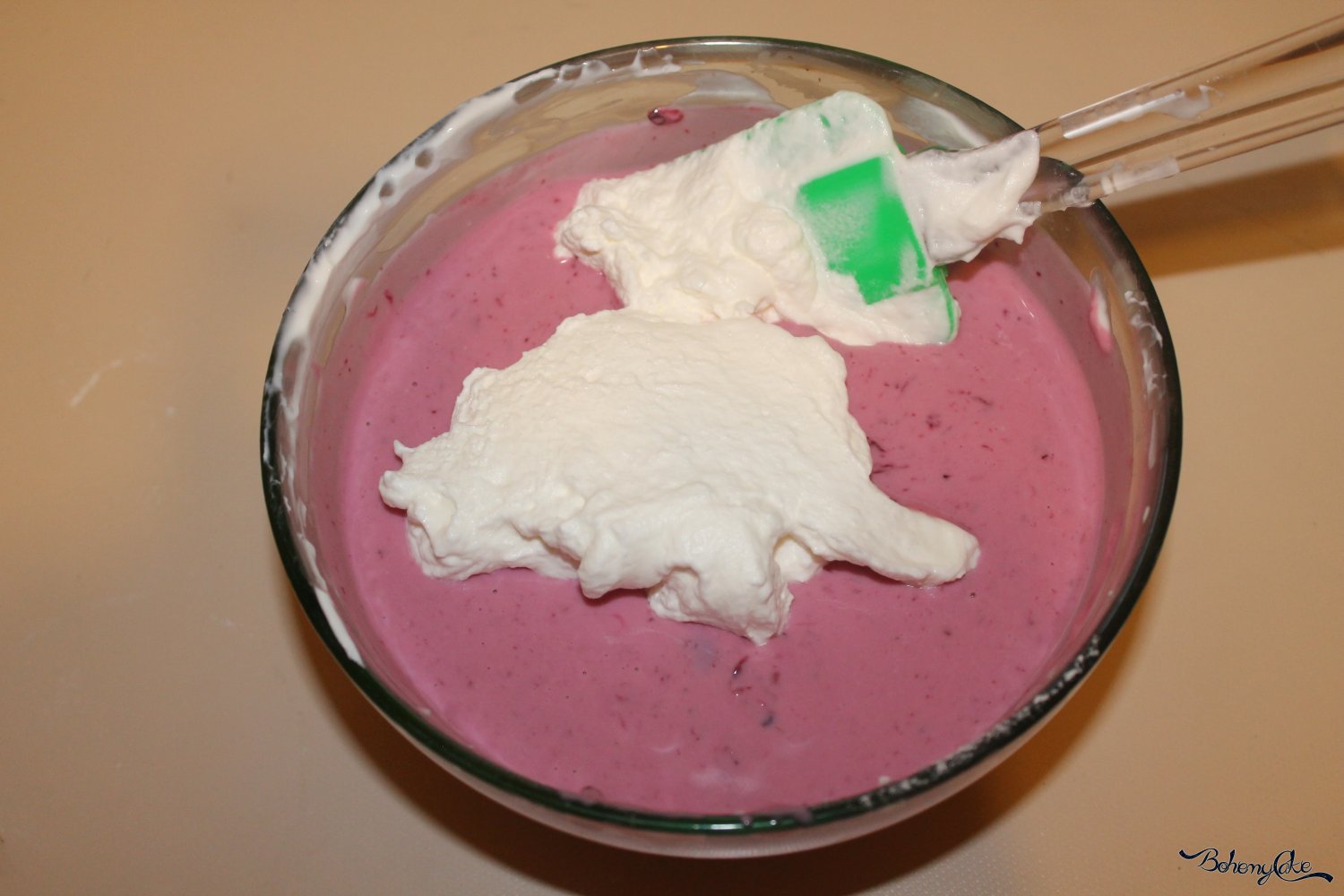 Montate con delle fruste, o in una planetaria, la panna fresca. Strizzate per bene la colla di pesce e unitela al latte, fatela sciogliere per bene il composto e aggiungetelo al composto di yogurt. Amalgamare per bene.