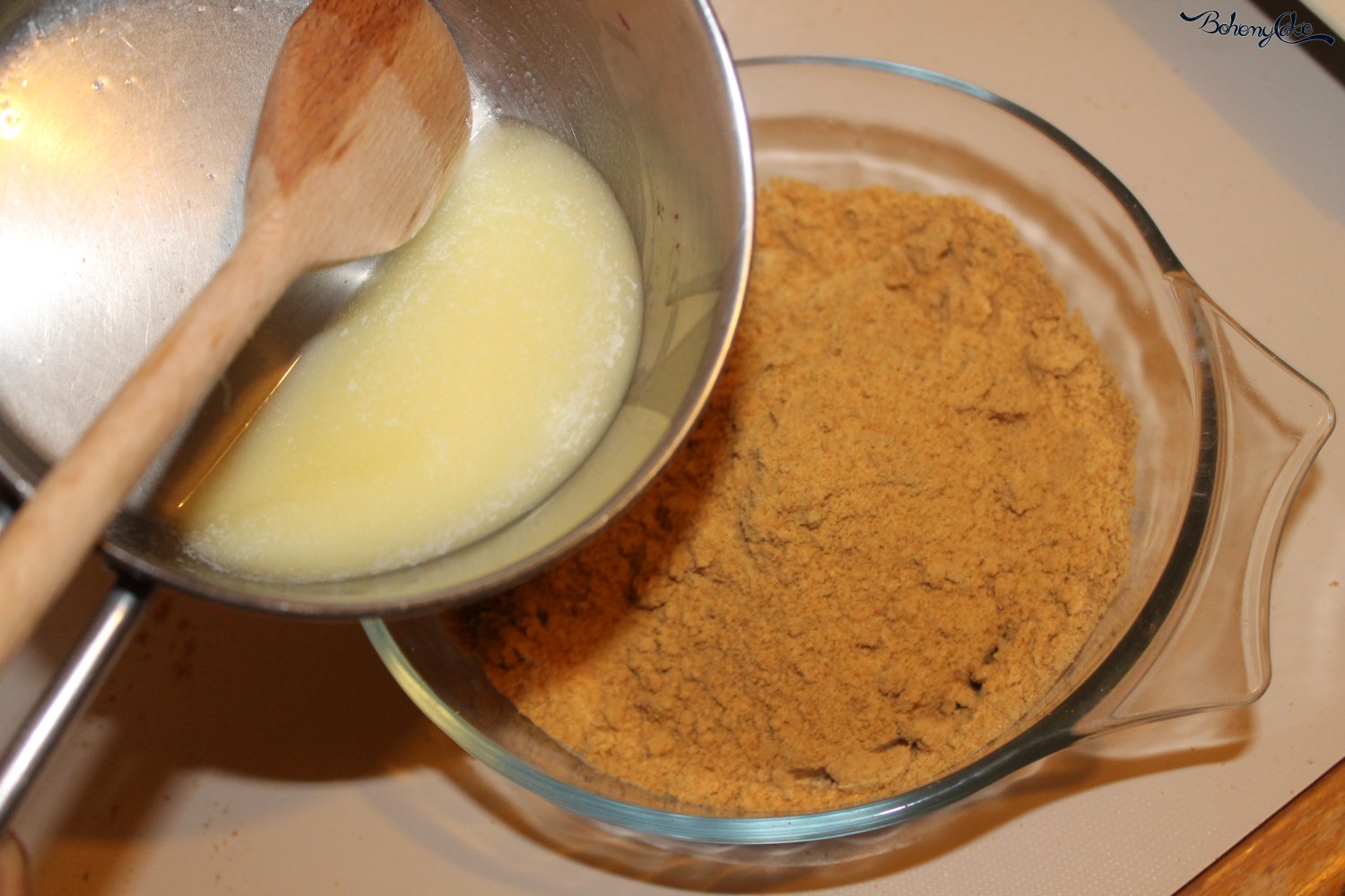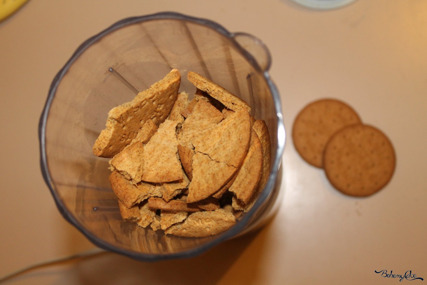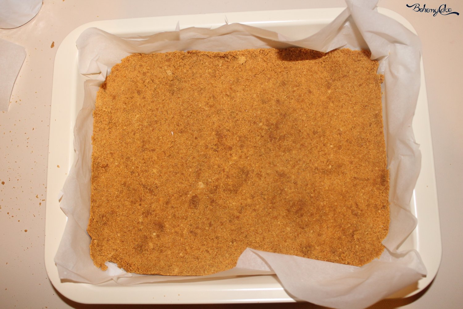 Come ultimo step, prepariamo la base croccante. In un mixer spezzettate i biscotti digestive e tritateli. Nel frattempo riscaldate il burro in un pentolino senza farlo bollire. Ora, in una terrina, mescolate i biscotti sbriciolati con il burro fuso. Amalgamate per bene il composto e mettetelo in una teglia con della carta forno. Comprimete per bene per ottenere una base omogenea. Ponetela in frigo a riposare per 1 ora.