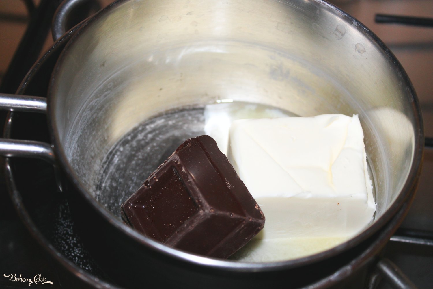 Versate a filo il cioccolato fuso con il burro nell’impasto delle uova. Setacciate la farina direttamente sul composto e mescolate delicatamente con un cucchiaio di legno. Aggiungete le amarene precedentemente tagliate e infarinate e mescolate sempre delicatamente.
