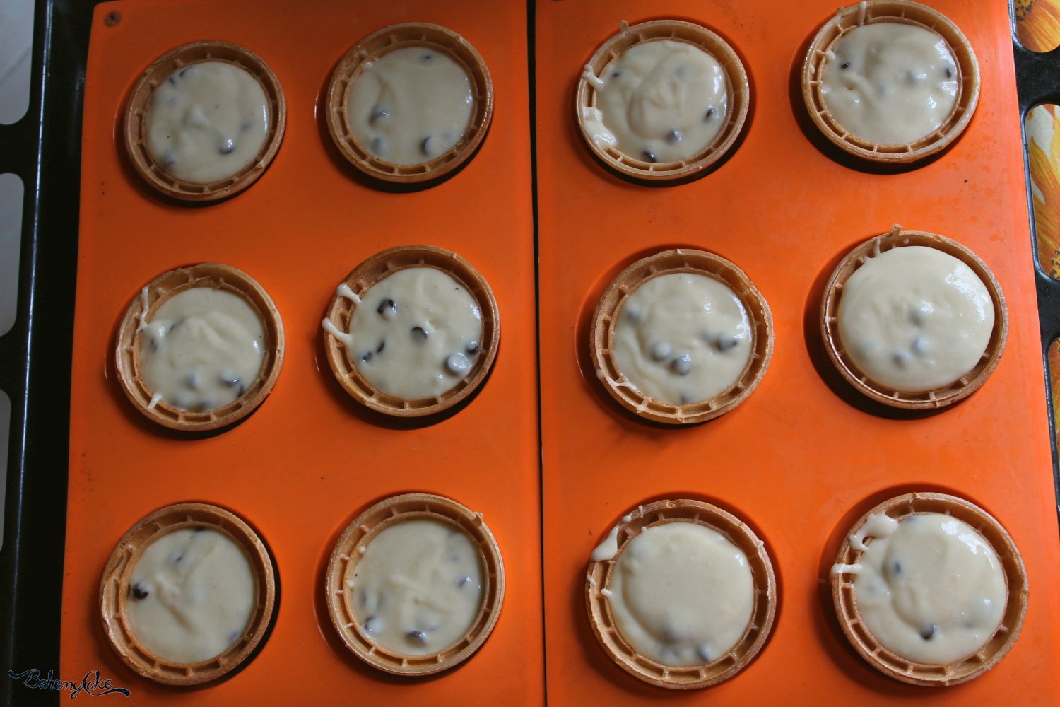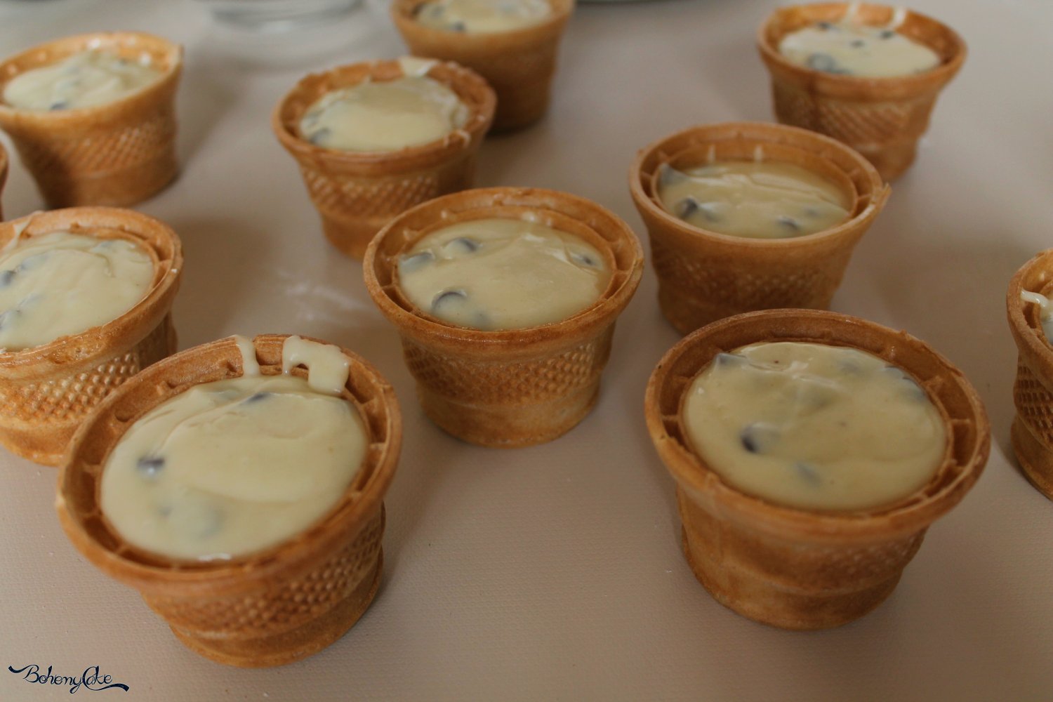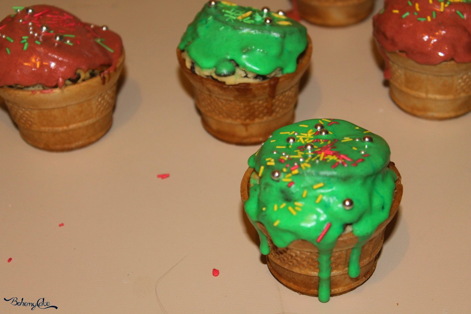 Disponete le cialde da gelato sulla carta forno, oppure in una stampo in silicone, riempite i coni fino a ¾ della loro altezza con l’impasto e cuocete a forno già caldo a 190°C per 20 minuti circa. Controllate sempre la cottura dei muffins con uno stuzzicadenti. Sformate le tortine e lasciatele raffreddare.