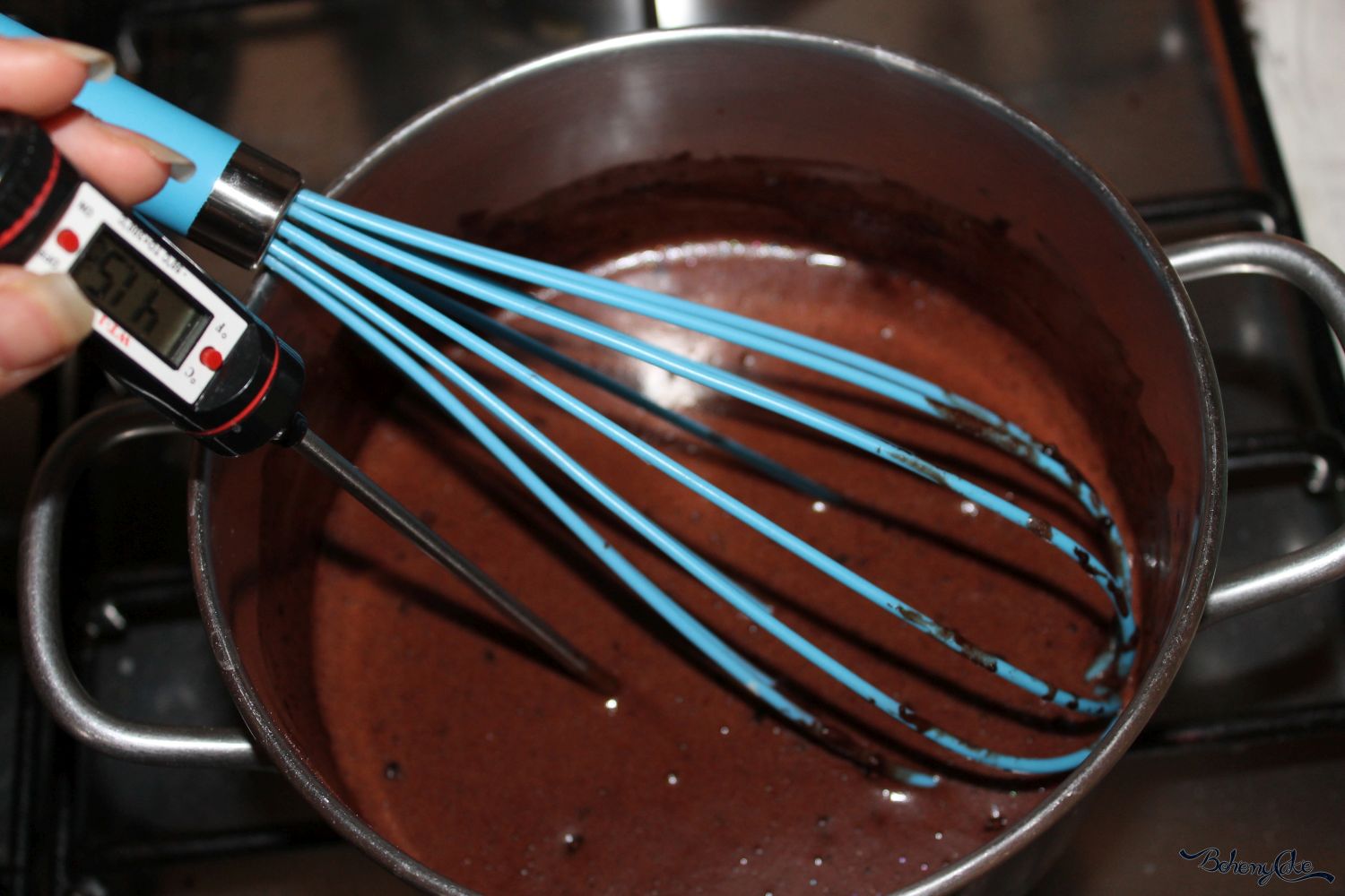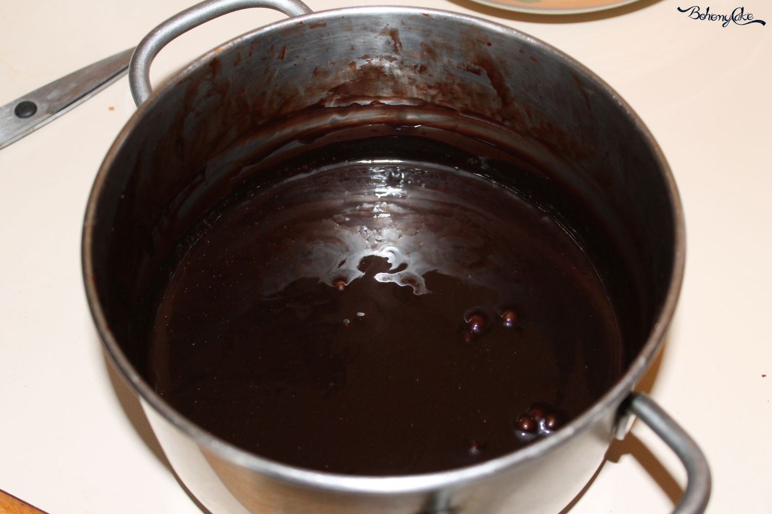 Se non avete il termometro peer preparare la glassa a specchio, per sapere quando il composto raggiunge i 130/140°, dovete preatare attenzione a quando l’ebollizione sarà forte, da far aumentare la panna di volume, attendete un minutino, quindi potete spegnere la fiamma.