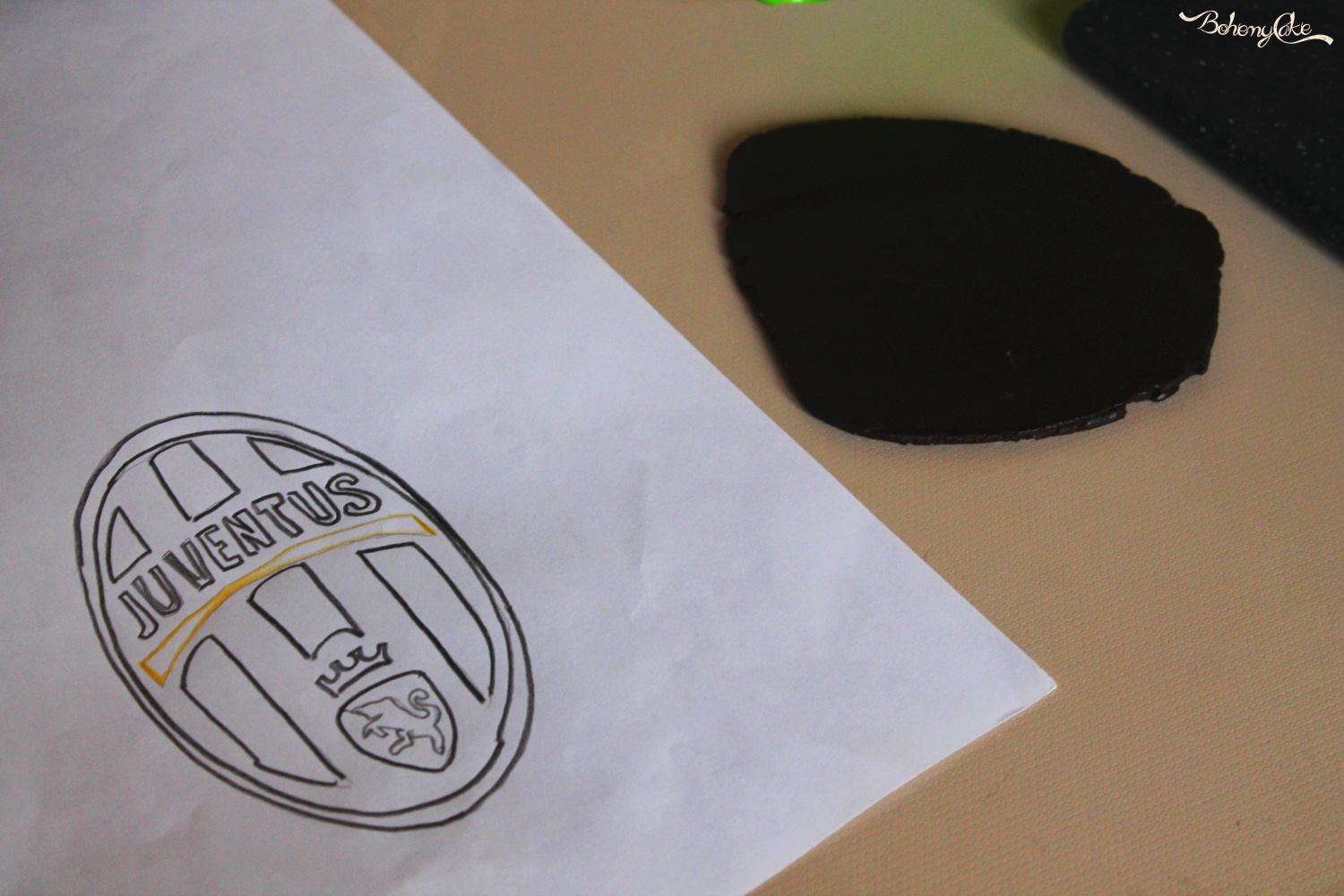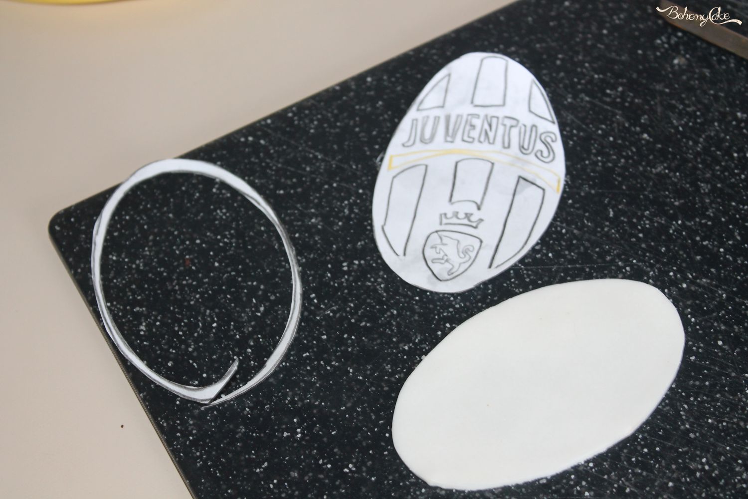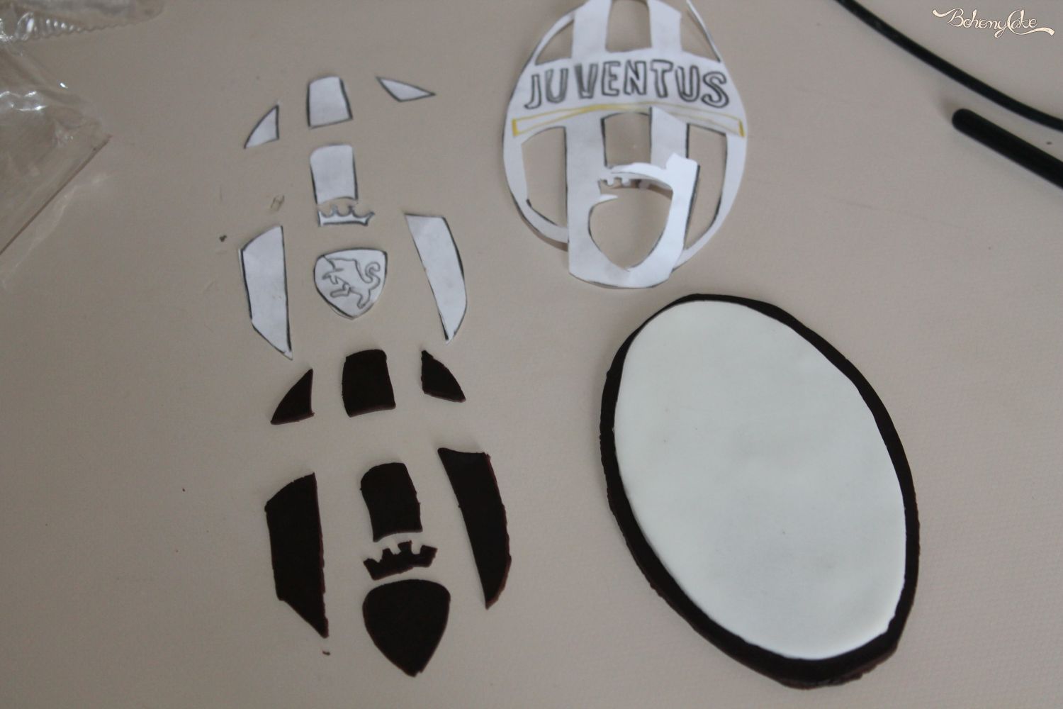 Ora passate alla decorazione. Iniziate stendendo la pasta di zucchero bianca e foderate la torta. Con un coppapasta a stella ricavate 3 stelle gialle e una ventina nere. Ora arriva la cosa più complicata, il logo della Juventus. Fatevi stampare ( o se come me sapete disegnare) il logo su un foglio di carta della misura che preferite. Ritagliate lo stemma con le forbici e appoggiato sulla pasta di zucchero nera ritagliando con un taglierino l’ovale di base, che poi fa da supporto e la bordura nera. Ritagliate dal foglio la parte nera e appoggiate il restante sulla pasta di zucchero bianca. Ora, di nuovo, ritagliate dalla stampa tutti i dettagli e con molta pazienza ricavateli dalla pasta di zucchero.